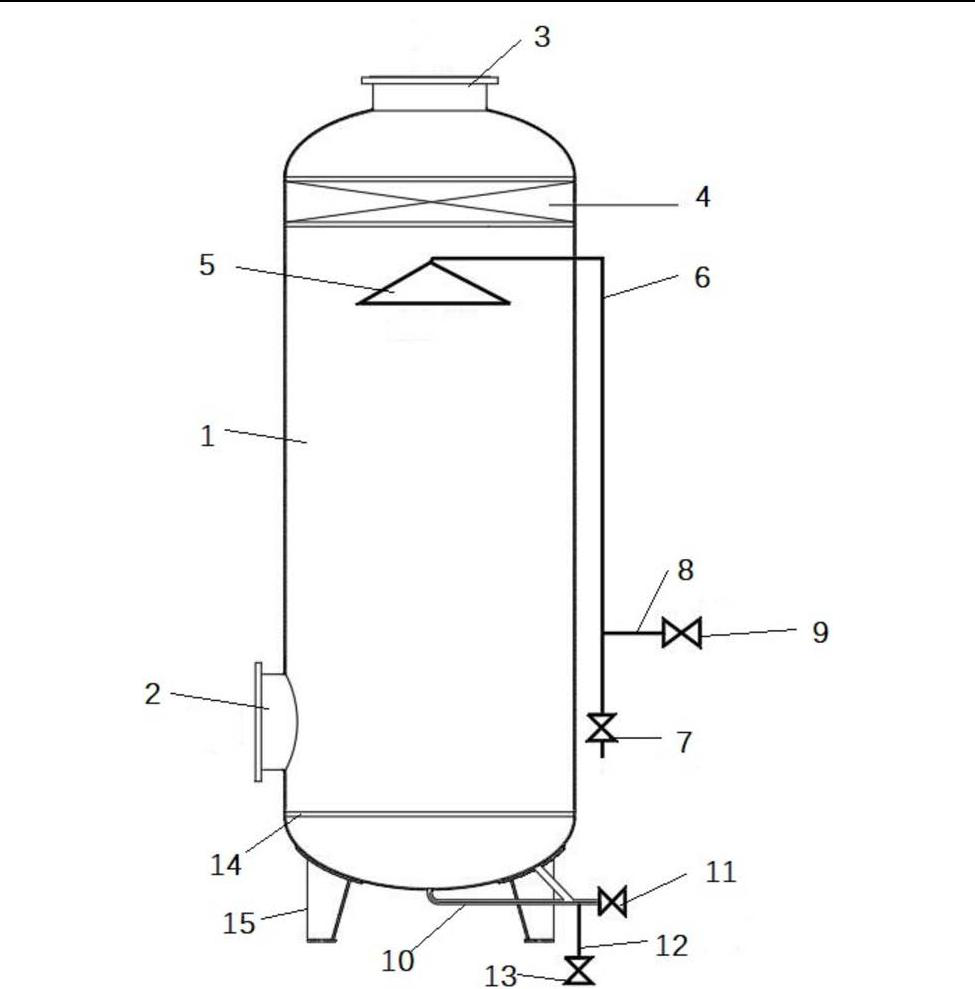 其中,1、分離器罐體;2、氣體進(jìn)口;3、氣體進(jìn)口;4、絲網(wǎng)除沫器;5、水洗噴頭;6、循環(huán)水進(jìn)水管;7、水進(jìn)管電磁閥;8、原料氣吹灰管;9、吹灰管電磁閥;10、循環(huán)水出水管;11、出水管電磁閥;12、原料氣反吹管;13、反吹管電磁閥;14、水位監(jiān)控裝置;15、支撐腳。