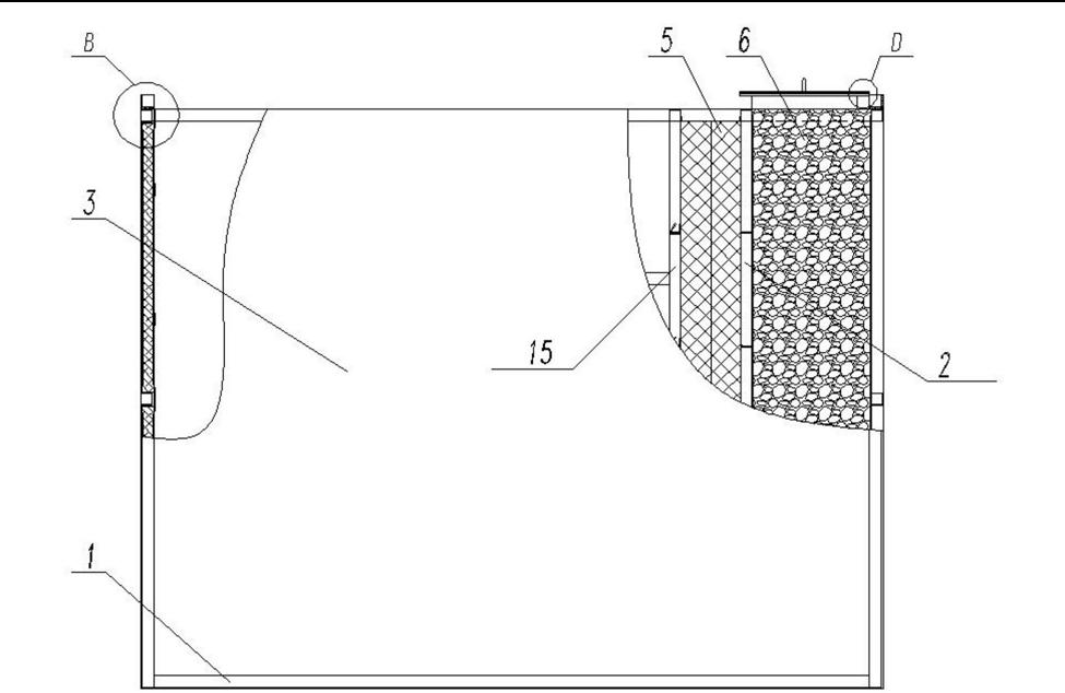 部設(shè)有除霧層和除沫層,液體在經(jīng)過除霧層和除沫層后能夠?qū)⒁后w中的霧氣和氣泡去除,所述除沫層設(shè)于除霧層的左側(cè),所述除沫層內(nèi)部設(shè)有絲網(wǎng)除沫器7,所述除霧層內(nèi)部包括板式除霧器5和除霧球6,所述板式除霧器5設(shè)于除霧球6的左側(cè),除霧球6與板式除霧器5之間設(shè)有隔離板一2,絲網(wǎng)除沫層5和除霧球6通過不同程度的除霧將液體中的霧氣去除,所述絲網(wǎng)除沫器7設(shè)于板式除霧器5的左側(cè),板式除霧器5和絲網(wǎng)除沫器7之間設(shè)有隔離板二15,所述噴淋段上殼體3的頂部設(shè)有通過螺栓組件4固定連接的兩塊除霧球封板9,除霧球封板9能夠防止在除霧過程中霧氣或者液體泄漏。值得注意的是,所述噴淋段上殼體3的四邊上設(shè)有等邊角鋼1,所述等邊角鋼1上設(shè)有安裝孔8,用于組件的固定和安裝。